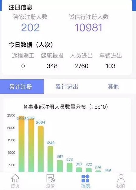 安小助疫期人员管理系统自上线以来,已为超万名用户提供服务。实时在线上报流动、变动情况,采用非接触式人员登记,有效的避免了因为接触产生交叉感染的风险,在疫情期间最大限度地保障员工安全,呵护业主健康。
